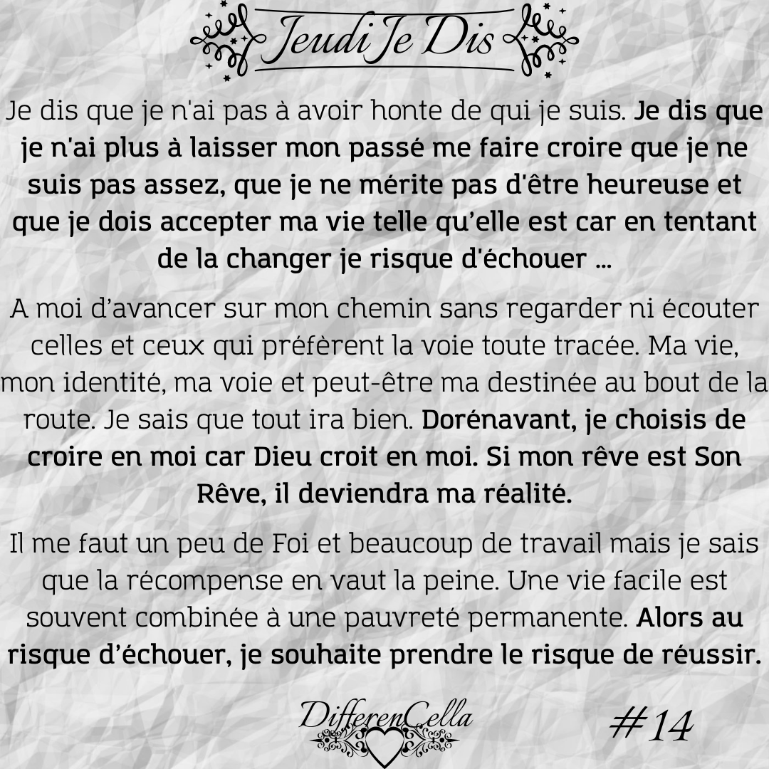 Je suis reconnaissante envers moi-même de ne pas avoir tout laisser tomber. Je suis fière de moi, de tous les efforts que j’ai pu réaliser pour arriver où j’en suis aujourd’hui. Certes, ma vie n‘est pas parfaite mais je crois que je réalise enfin tout le chemin que j’ai parcouru.