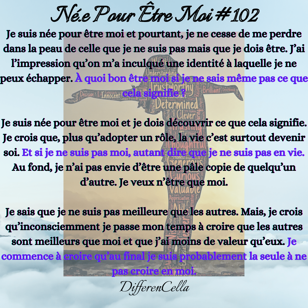 Je suis née pour être moi et pourtant, je ne cesse de me perdre dans la peau de celle que je ne suis pas mais que je dois être. J’ai l’impression qu’on m’a inculqué une identité à laquelle je ne peux échapper. À quoi bon être moi si je ne sais même pas ce que cela signifie ?