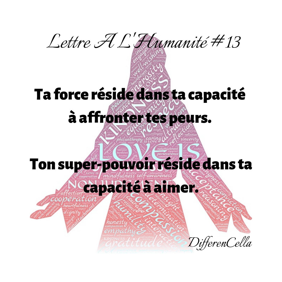 Tes combats sont faits pour te transformer en guerrier ou guerrière. Tes peurs sont faites pour être affrontées. Te confronter à tes peurs te rend invincibles. Tu es fait pour t’accepter et t’aimer tel que tu es car tu en es capable. T’accepter et t’aimer comme tu es te permet de devenir un super-humain(e).