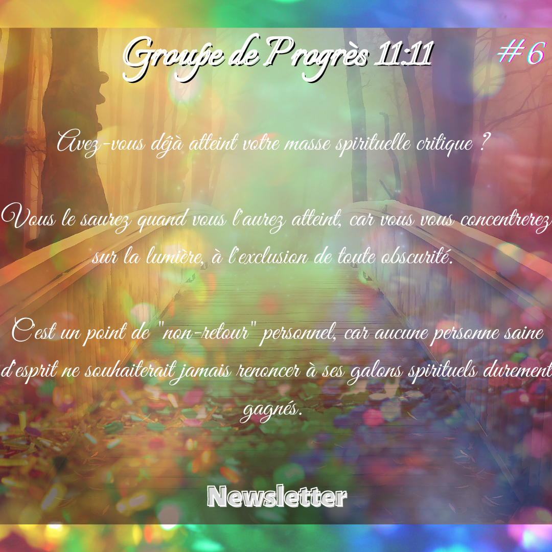 Avez-vous déjà atteint votre masse spirituelle critique ? Vous le saurez quand vous l’aurez atteint, car vous vous concentrerez sur la lumière, à l’exclusion de toute obscurité. C’est un point de « non-retour » personnel, car aucune personne saine d’esprit ne souhaiterait jamais renoncer à ses galons spirituels durement gagnés.