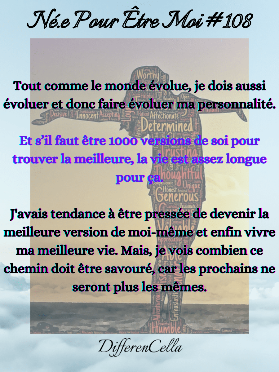 Je crois que je commence à me trouver. J’imagine que c’est la dixième fois que je le dis donc ce ne sera sûrement pas la dernière. Mais, la différence, c’est que cette fois-ci, j’ai intégré le fait qu’il est normal de se redéfinir. Tout comme le monde évolue, je dois aussi évoluer et donc faire évoluer ma personnalité.