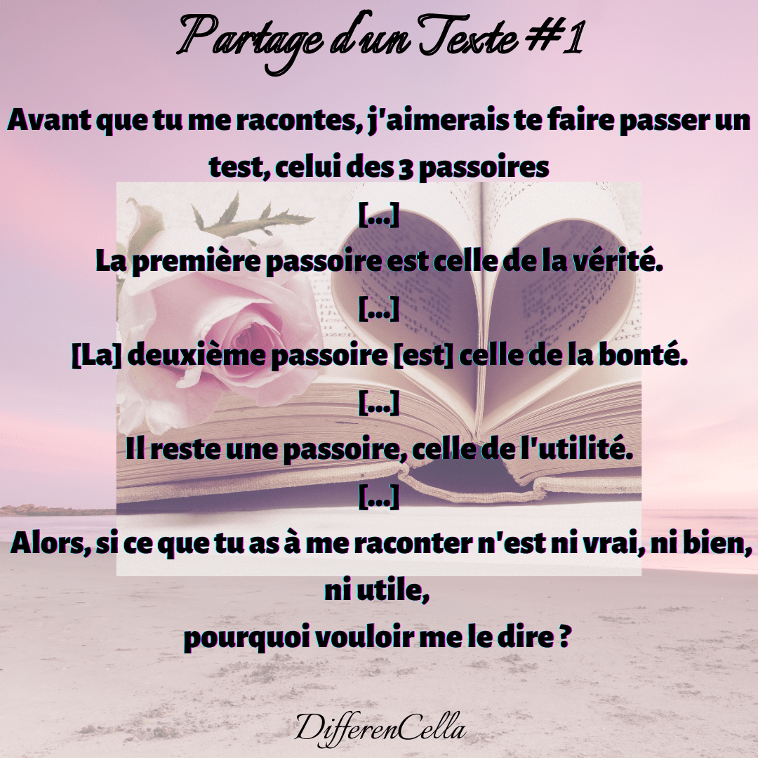 – Essayons de filtrer autrement en utilisant une deuxième passoire, celle de la bonté. Ce que tu veux m’apprendre sur mon ami, est-ce quelque chose de bon ?