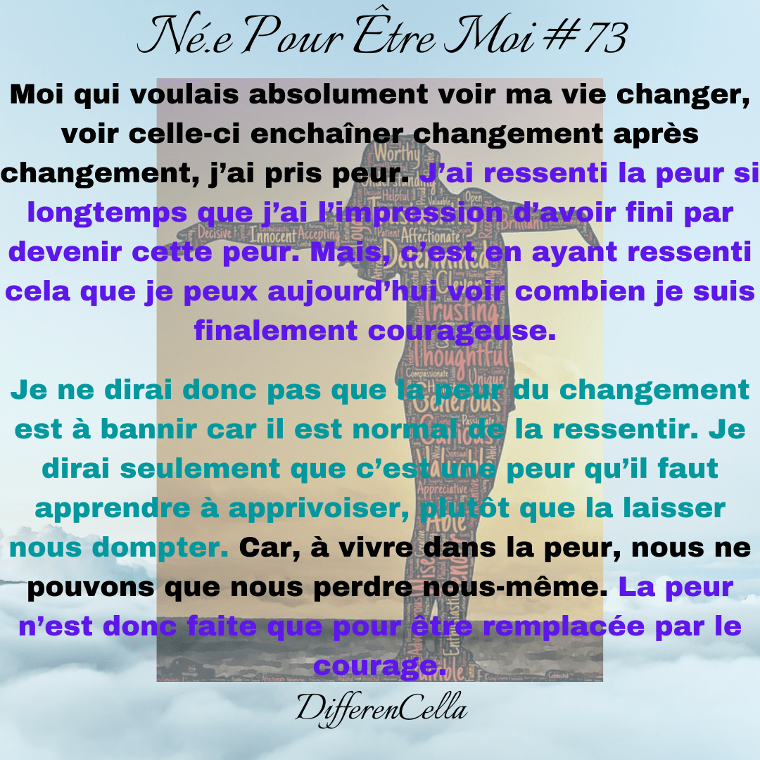 Moi qui voulais absolument voir ma vie changer, voir celle-ci enchaîner changement après changement, j’ai pris peur. J’ai ressenti la peur si longtemps que j’ai l’impression d’avoir fini par devenir cette peur. Mais, c’est en ayant ressenti cela que je peux aujourd’hui voir combien je suis finalement courageuse.