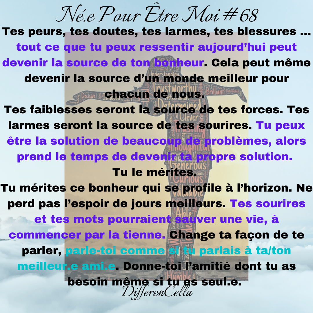 Tu mérites ce bonheur qui se profile à l’horizon. Ne perd pas l’espoir de jours meilleurs. Tes sourires et tes mots pourraient sauver une vie, à commencer par la tienne. Change ta façon de te parler, parle-toi comme si tu parlais à ta/ton meilleur.e ami.e. Donne-toi l’amitié dont tu as besoin même si tu es seul.e.