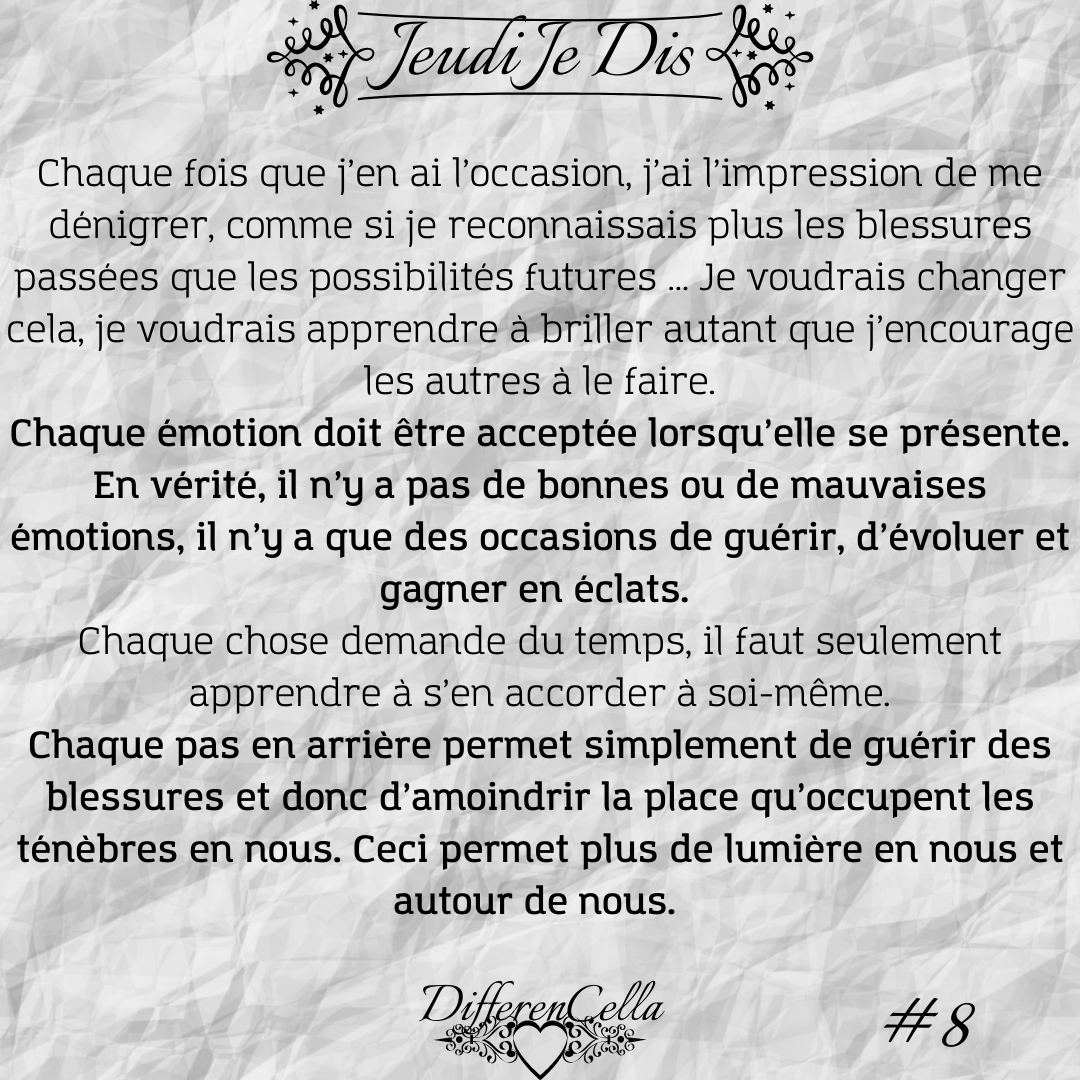 J’ai peur de revenir en arrière par peur d’y rester bloquer plus qu’il ne le faut. Et en même temps, je sais que parfois, faire un pas en arrière est nécessaire pour prendre de l’élan avant un grand saut. Chaque fois que j’en ai l’occasion, j’ai l’impression de me dénigrer, comme si je reconnaissais plus les blessures passées que les possibilités futures … Je voudrais changer cela, je voudrais apprendre à briller autant que j’encourage les autres à le faire.