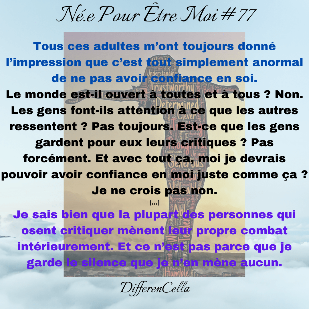 Le monde est-il ouvert à toutes et à tous ? Non. Les gens font-ils attention à ce que les autres ressentent ? Pas toujours. Est-ce que les gens gardent pour eux leurs critiques ? Pas forcément. Et avec tout ça, moi je devrais pouvoir avoir confiance en moi juste comme ça ? Je ne crois pas non.