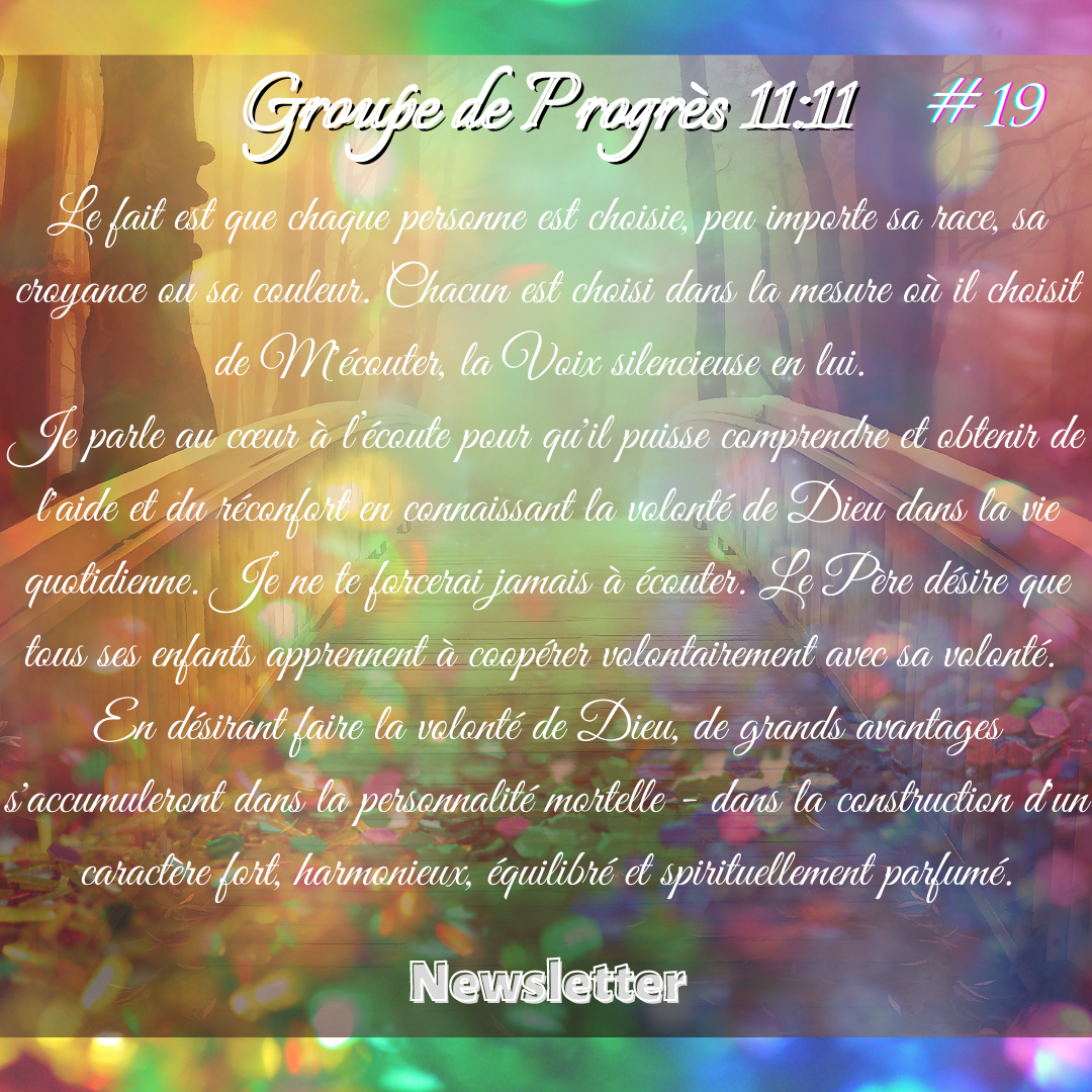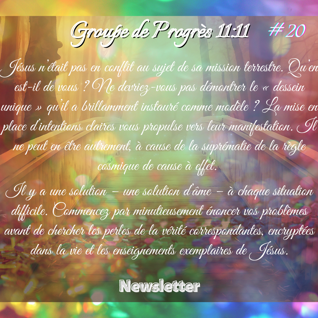 Il y a une solution – une solution d’âme – à chaque situation difficile. Commencez par minutieusement énoncer vos problèmes avant de chercher les perles de la vérité correspondantes, encryptées dans la vie et les enseignements exemplaires de Jésus. Vous deviendrez un expert dans le déchiffrement dans son apport subliminal toujours adéquat. En tant qu’homme parmi les hommes, Jésus était pleinement conscient des défis de la condition humaine, et bien expérimenté en toutes les questions du cœur. »