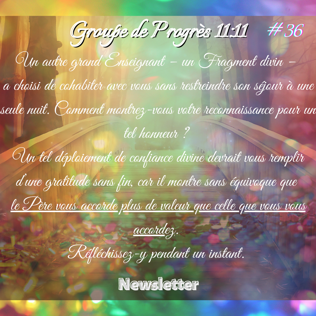 Un autre grand Enseignant – un Fragment divin – a choisi de cohabiter avec vous sans restreindre son séjour à une seule nuit. Comment montrez-vous votre reconnaissance pour un tel honneur ? Un tel déploiement de confiance divine devrait vous remplir d’une gratitude sans fin, car il montre sans équivoque que le Père vous accorde plus de valeur que celle que vous vous accordez. Réfléchissez-y pendant un instant.