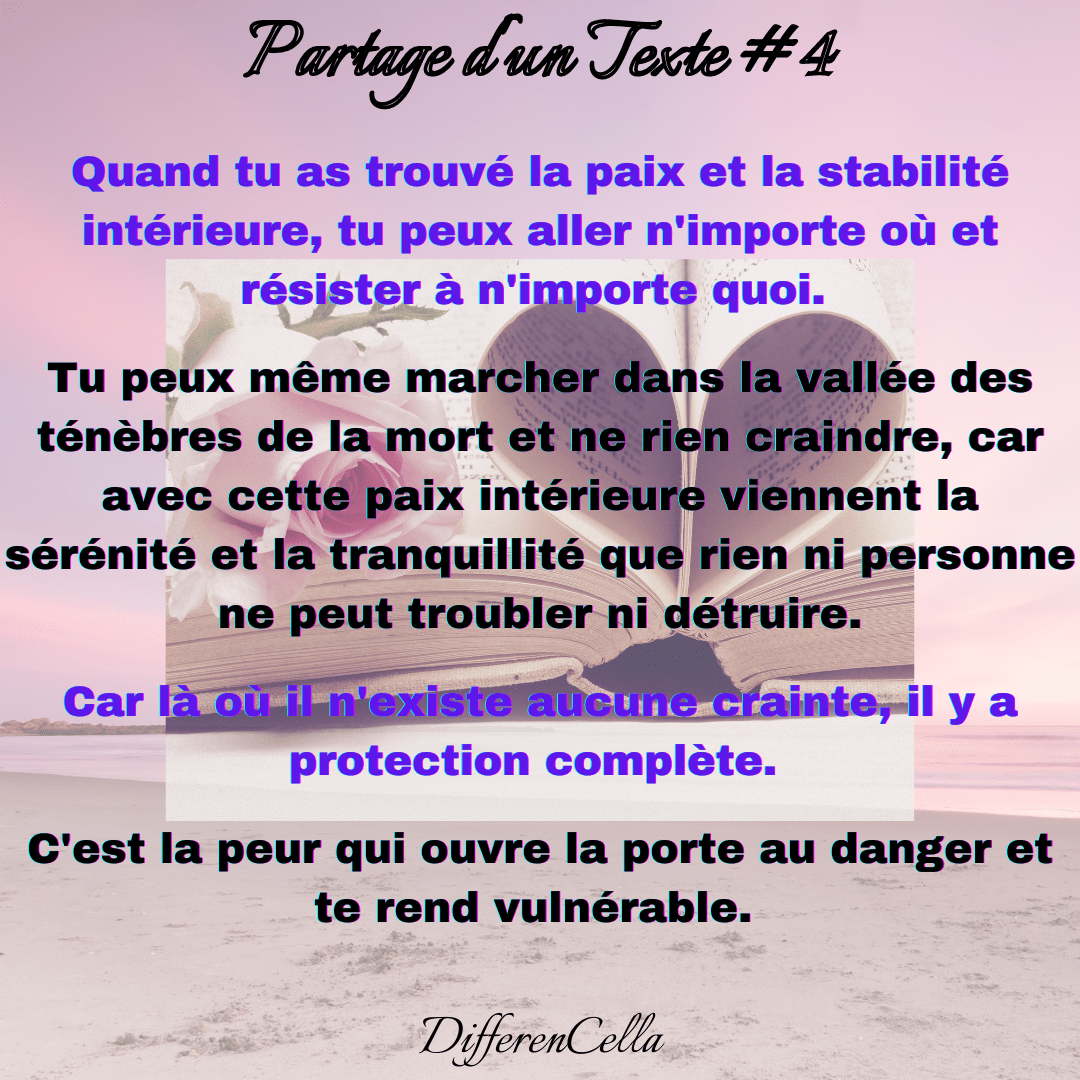 Tu peux même marcher dans la vallée des ténèbres de la mort et ne rien craindre, car avec cette paix intérieure viennent la sérénité et la tranquillité que rien ni personne ne peut troubler ni détruire.