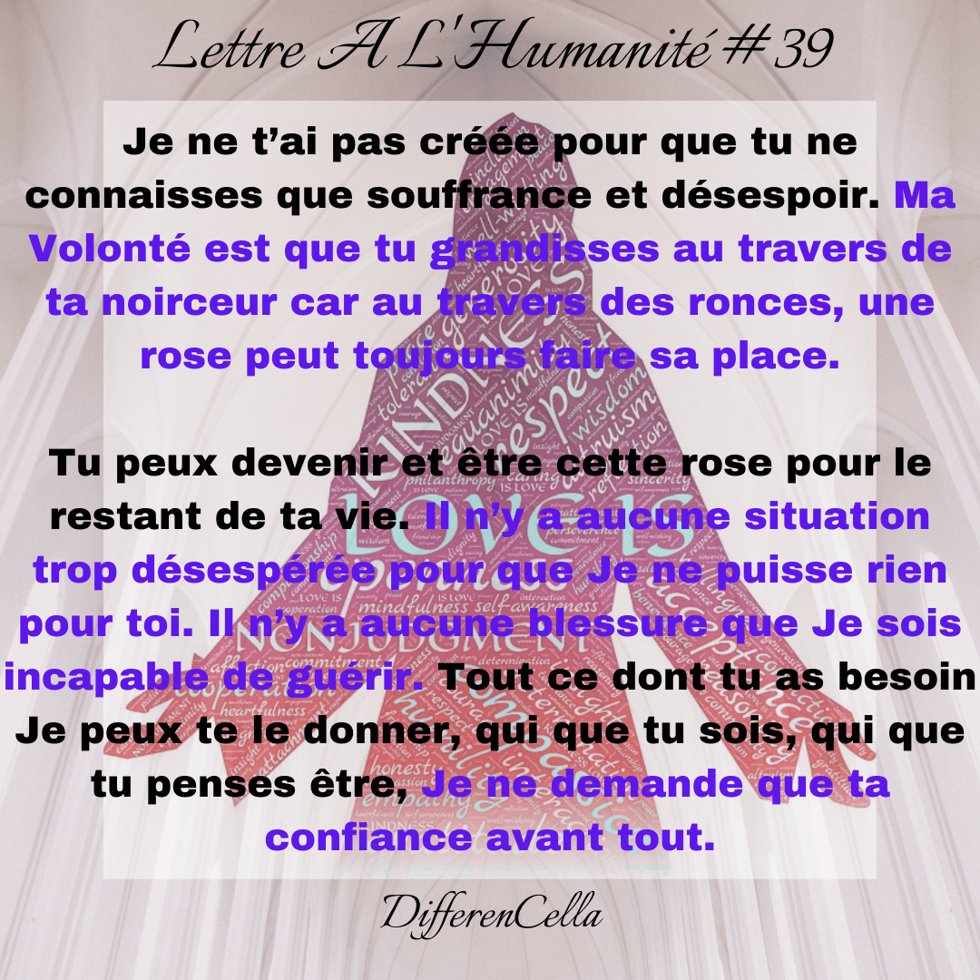 Je sais que cela paraît fou dit comme cela. Mais, Je ne t’ai pas créée pour que tu ne connaisses que souffrance et désespoir. Ma Volonté est que tu grandisses au travers de ta noirceur car au travers des ronces, une rose peut toujours faire sa place.