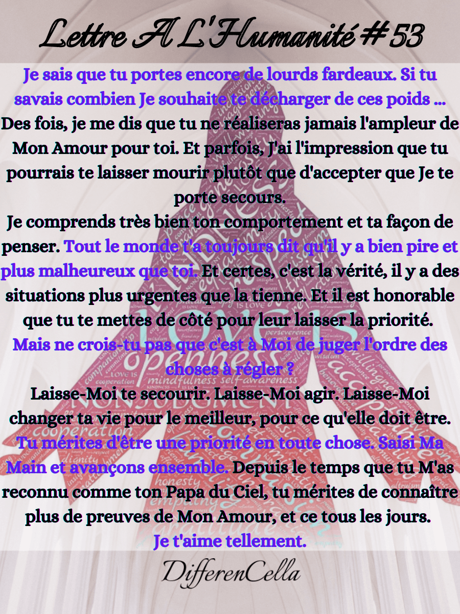 Je sais que tu portes encore de lourds fardeaux. Il y en a même certains dont tu n’as pas encore conscience. Si tu savais combien Je souhaite te décharger de ces poids … Des fois, je me dis que tu ne réaliseras jamais l’ampleur de Mon Amour pour toi. Et parfois, J’ai l’impression que tu pourrais te laisser mourir plutôt que d’accepter que Je te porte secours.