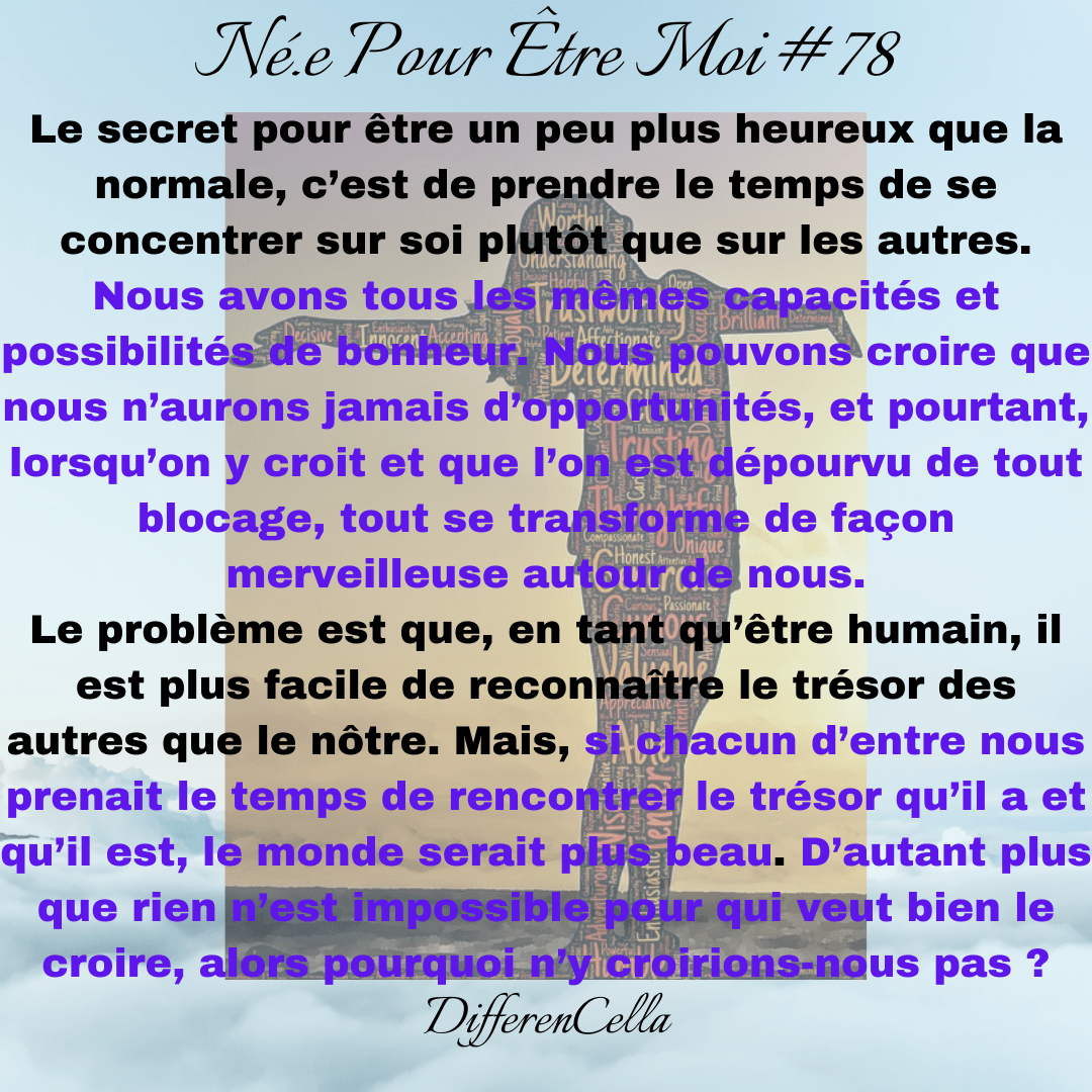 Nous renfermons tous des trésors au fond de nous qui nous suffit d’aller chercher. Le problème est que, en tant qu’être humain, il est plus facile de reconnaître le trésor des autres que le nôtre. Il nous est plus facile de croire que nous sommes tous différents alors que nous nous ressemblons tous plus ou moins.