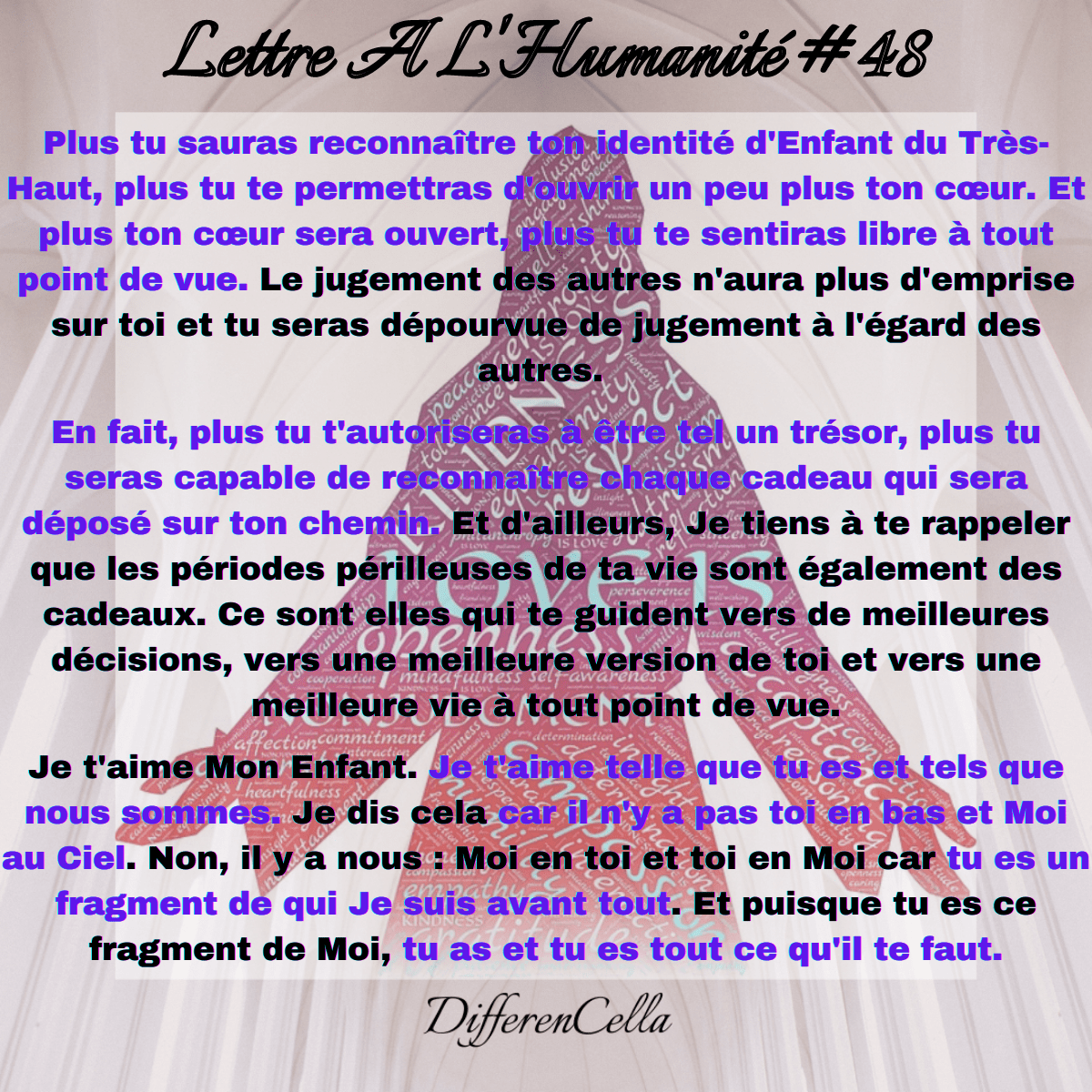 Je t’aime Mon Enfant. Je t’aime telle que tu es et tels que nous sommes. Je dis cela car il n’y a pas toi en bas et Moi au Ciel. Non, il y a nous : Moi en toi et toi en Moi car tu es un fragment de qui Je suis avant tout. Et puisque tu es ce fragment de Moi, tu as et tu es tout ce qu’il te faut.