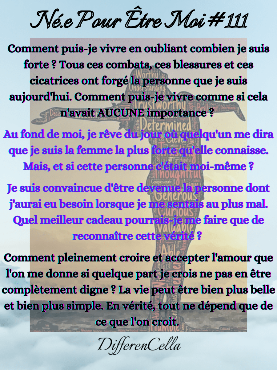 Comment puis-je vivre en oubliant combien je suis forte ? Tous ces combats, ces blessures et ces cicatrices ont forgé la personne que je suis aujourd’hui. Comment puis-je vivre comme si cela n’avait AUCUNE importance ? Au fond de moi, je rêve du jour où quelqu’un me dira que je suis la femme la plus forte qu’elle connaisse. Mais, et si cette personne c’était moi-même ?