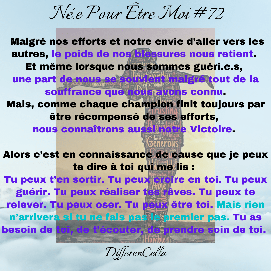 Tu peux t’en sortir. Tu peux croire en toi. Tu peux guérir. Tu peux réaliser tes rêves. Tu peux te relever. Tu peux oser. Tu peux être toi. Mais rien n’arrivera si tu ne fais pas le premier pas. Tu as besoin de toi, de t’écouter, de prendre soin de toi.