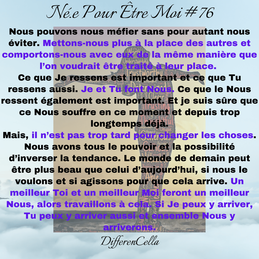 Nous pouvons nous méfier sans pour autant nous éviter. Mettons-nous plus à la place des autres et comportons-nous avec eux de la même manière que l’on voudrait être traité à leur place.