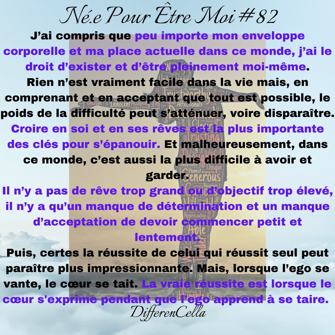 J’ai enfin compris et accepter que j’ai le droit de réussir et j’ai le droit de m’épanouir. J’ai le droit de rêver et de rester fidèle à mes rêves. J’ai compris que peu importe mon enveloppe corporelle et ma place actuelle dans ce monde, j’ai le droit d’exister et d’être pleinement moi-même.