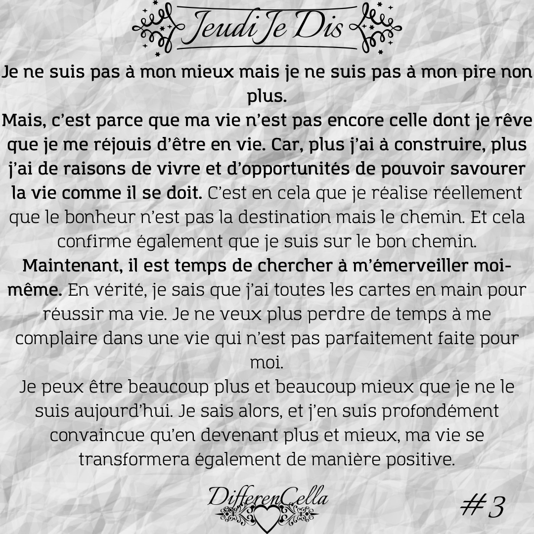 Cette série me permettra de m’exprimer plus librement qu’au travers de mes « Né.e Pour Être Moi ». Car, même si ces textes me libèrent, il n’y a qu’une partie de moi qui s’exprime, celle que je souhaite incarner à 100%. Alors avec mes « Jeudi Je Dis », je vais m’octroyer plus de liberté. Je vais plus m’exprimer en tant que la personne que je suis plutôt que celle que je souhaite devenir.