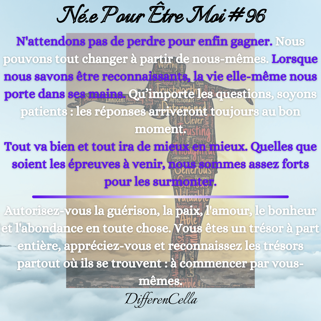 N’attendons pas de perdre pour enfin gagner. Nous pouvons tout changer à partir de nous-mêmes. Lorsque nous savons être reconnaissants, la vie elle-même nous porte dans ses mains. Qu’importe les questions, soyons patients : les réponses arriveront toujours au bon moment.