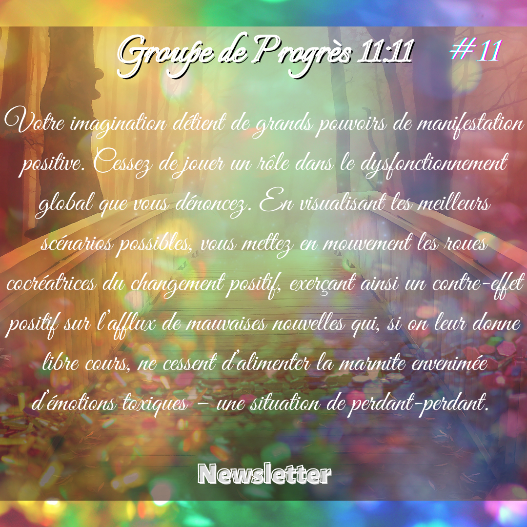 Votre imagination détient de grands pouvoirs de manifestation positive. Cessez de jouer un rôle dans le dysfonctionnement global que vous dénoncez. En visualisant les meilleurs scénarios possibles, vous mettez en mouvement les roues cocréatrices du changement positif, exerçant ainsi un contre-effet positif sur l’afflux de mauvaises nouvelles qui, si on leur donne libre cours, ne cessent d’alimenter la marmite envenimée d’émotions toxiques – une situation de perdant-perdant.