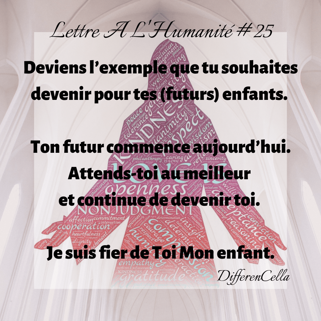 Deviens l’exemple que tu souhaites devenir pour tes (futurs) enfants. Ton futur commence aujourd’hui. Attends-toi au meilleur et continue de devenir toi. Je suis fier de Toi Mon enfant. Tu as beaucoup souffert et grandi ces derniers temps. Ta vie est sur le point de changer. Je te donne et te rends ce qui te rends le/la plus heureux.se.