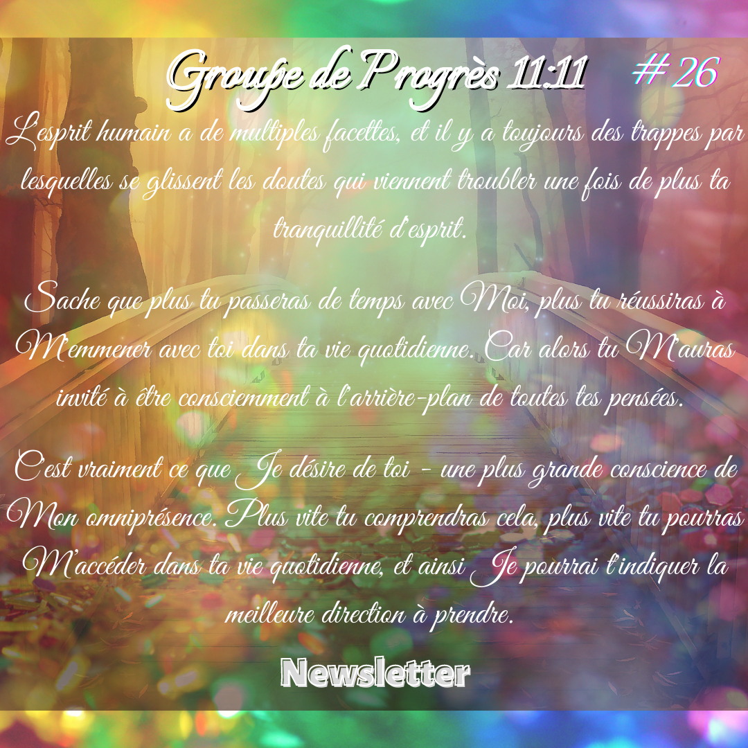 Le Bien-Aimé : « Pour augmenter ta foi, il te suffit de te tourner vers l’intérieur et de rester un moment pour profiter d’un véritable repos. Ta foi recevra une infusion lorsque tu ressentiras Ma proximité, qui est un baume pour l’âme. Tu sais déjà que même dans ta solitude, tu n’es jamais vraiment seule.