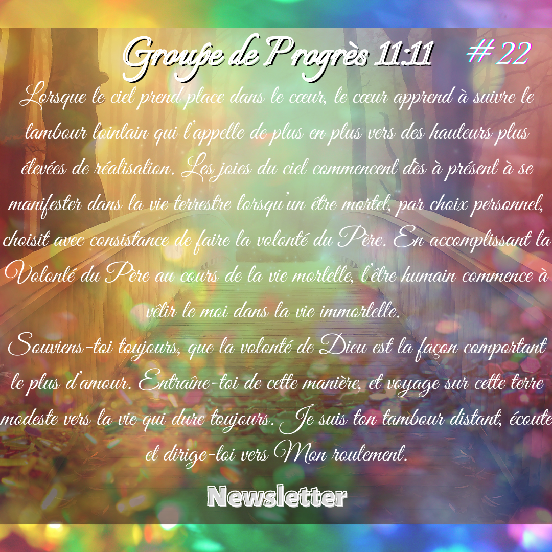 Lorsque le ciel prend place dans le cœur, le cœur apprend à suivre le tambour lointain qui l’appelle de plus en plus vers des hauteurs plus élevées de réalisation. Les joies du ciel commencent dès à présent à se manifester dans la vie terrestre lorsqu’un être mortel, par choix personnel, choisit avec consistance de faire la volonté du Père. En accomplissant la Volonté du Père au cours de la vie mortelle, l’être humain commence à vêtir le moi dans la vie immortelle.