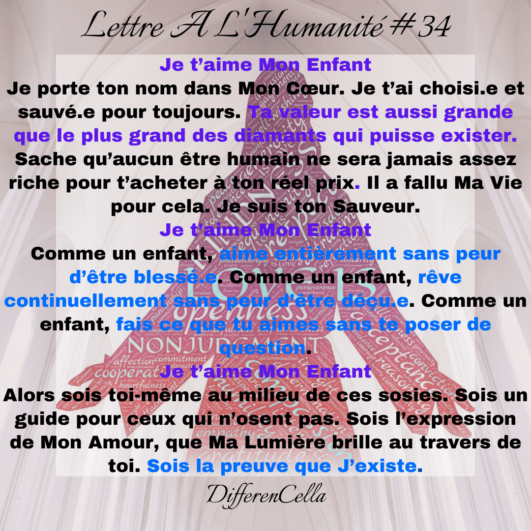 Je porte ton nom dans Mon Cœur. Je t’ai choisi.e et sauvé.e pour toujours. Ta valeur est aussi grande que le plus grand des diamants qui puisse exister. Sache qu’aucun être humain ne sera jamais assez riche pour t’acheter à ton réel prix. Il a fallu Ma Vie pour cela. Je suis ton Sauveur.